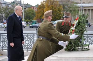 A hivatalos magyarországi látogatáson tartózkodó Nadzsíb Mikáti libanoni miniszterelnök koszorút helyez el a Hõsök Emlékkövénél a Hõsök terén 2012. november 6-án.