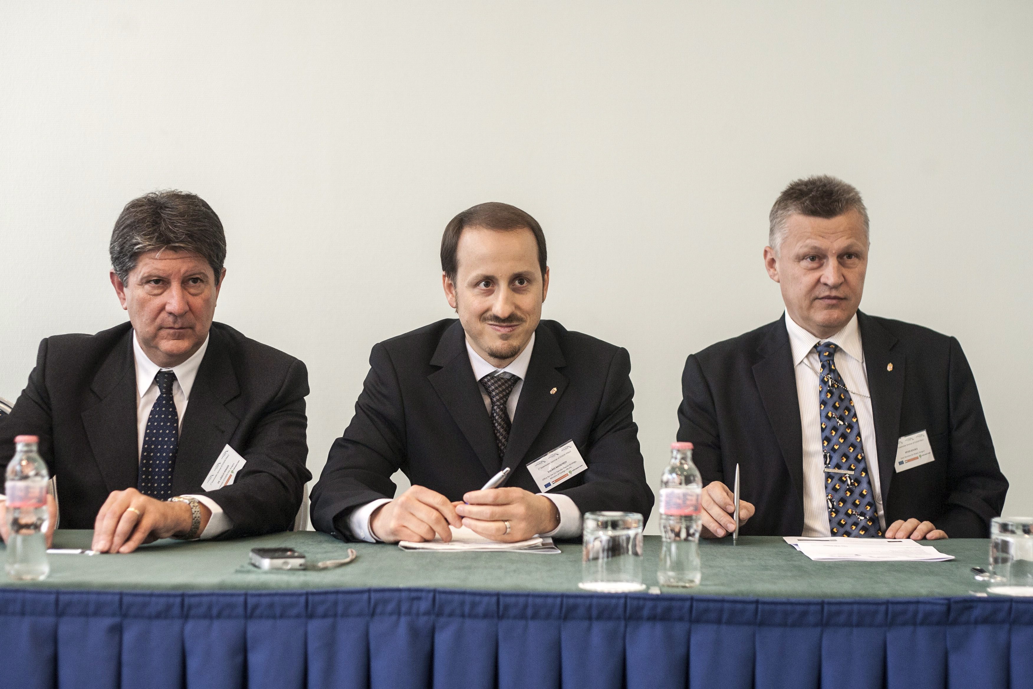 Perger László, a Nemzeti Környezetügyi Intézet fõosztályvezetõje, Medgyesy Balázs, a Duna-stratégiáért felelõs kormánybiztos és Kovács Péter vízügyért felelõs államtitkár (b-j) az Európai Duna Régió Stratégia Környezetvédelmi Pillére partneri szemináriumának sajtótájékoztatóján a budapesti Danubius Hotel Helia szállóban 2012. november 6-án.